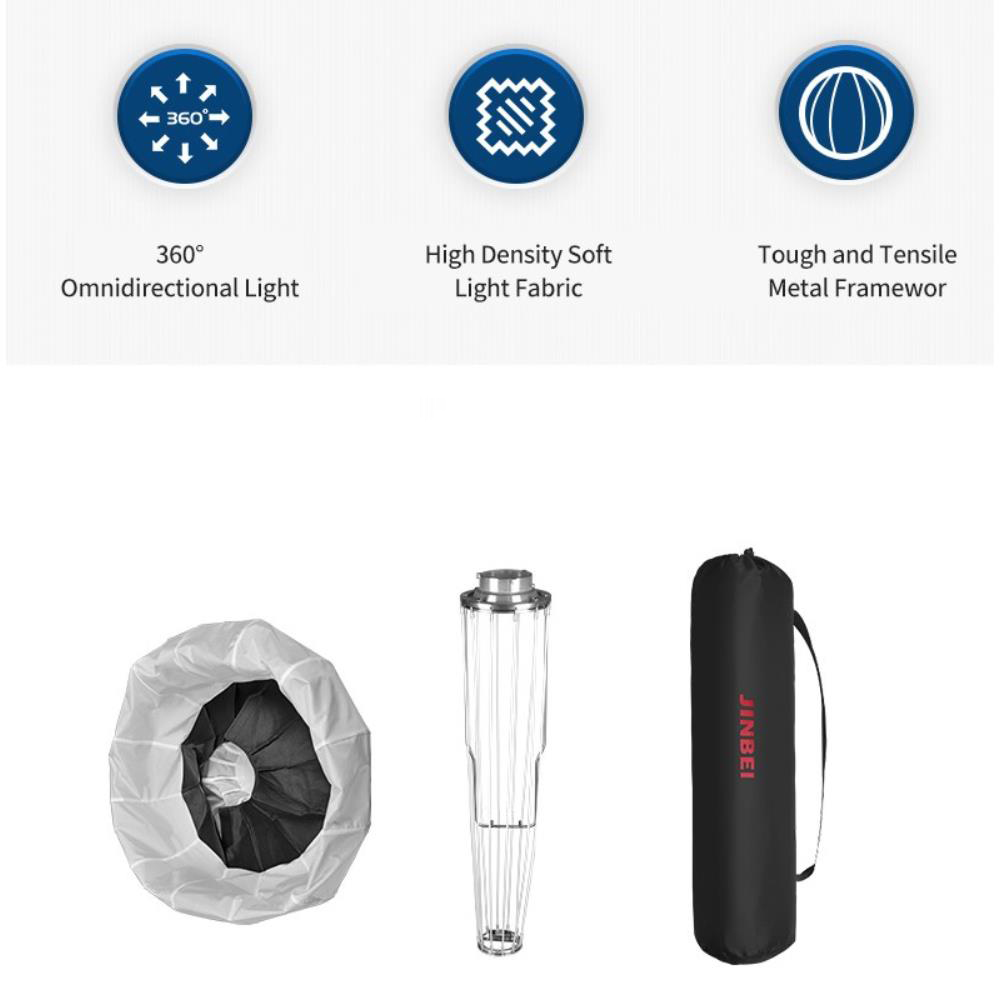 Jinbei Quick Ball Softbox 65cm. Το πτυσσόμενο Jinbei Quick Ball Softbox 65cm με μοντούρα Bowens είναι ένα σχεδόν στρογγυλό εξάρτημα διαμόρφωσης του φωτός με διάμετρο 65 cm και παρέχεται με τσάντα μεταφοράς.